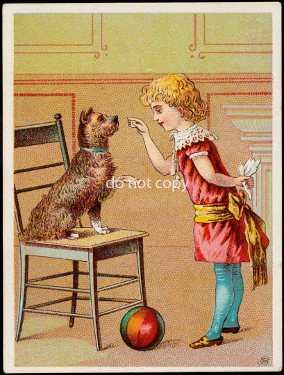 a girl playing with a dog on a chair who is lifting its paw